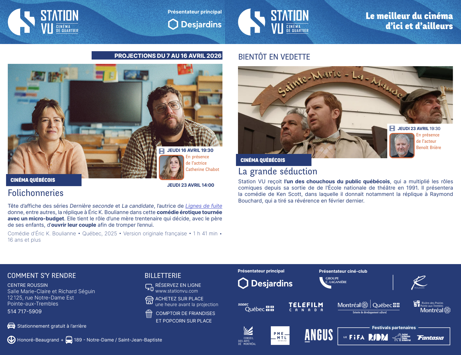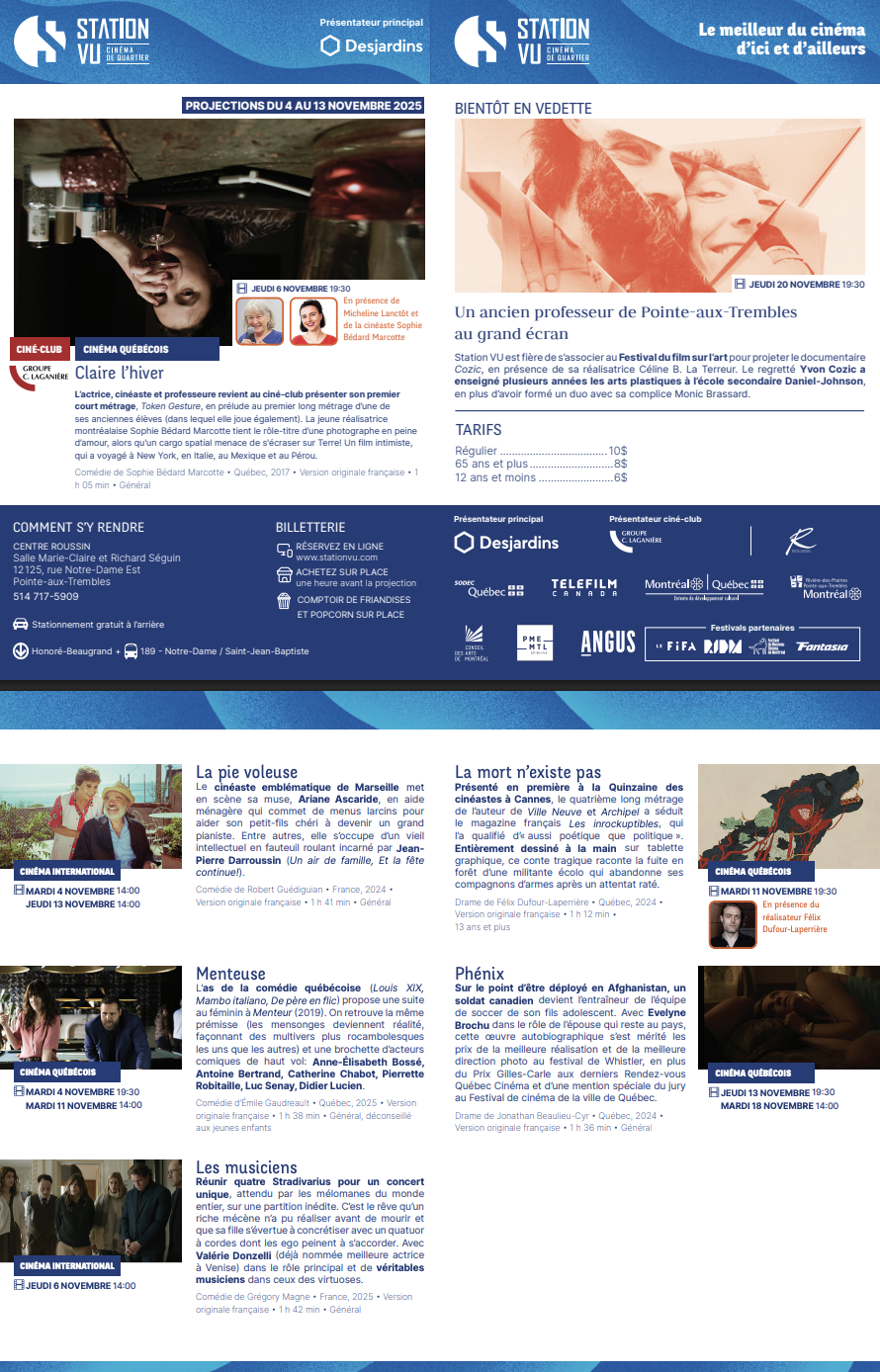 Station VU propose une programmation régulière de 3 ou 4 projections par semaine durant l’automne, l’été et l’hiver. Nous sélectionnons les meilleurs films du Québec, du Canada et de l’étranger, en plus de réserver une place au documentaire. Des programmations spéciales (événements, ciné-club, etc.) s’ajoutent pendant l’année.